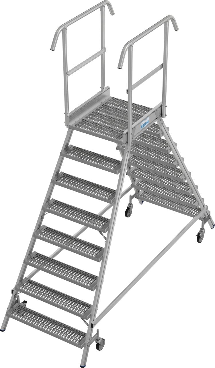 - Két oldalon járható gurítható alumínium dobogó 180 mm mély lépcsőfokokkal és nagy állófelülettel R13 csúszásmentes profilrácsból, amely körbefutó dobogókorláttal van felszerelve a biztonságos és kényelmes munkavégzés érdekében.